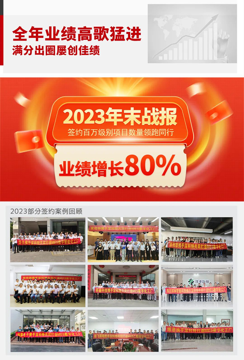2023年是中國經濟蕭條、市場持續低迷的一年,相比2022年的經濟萎靡,2023年可謂雪上加霜,據有關媒體報道,全國倒閉企業超過130萬家,大多數行業的訂單下滑30%以上。雖然中國面臨嚴峻的國際形勢和國內經濟形勢的酷暑,但深科特在MES行業憑借自身過硬的實力不負所望,業績持續飛速增長,2023年比2022年實現業績增長80%。2023年也是深科特厚積薄發的一年,雖然市場風云變化波瀾起伏,但是我們預判精準,不負眾望迅速成長。